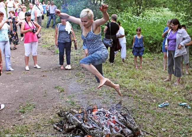 Встречать ночь на Ивана Купалу в историко-архитектурном комплексе «Теремок» стало уже традицией. И хотя в этом году у смолян была альтернатива - поехать во Фленово или отправиться на речку Ольшанку в Гнездово, многие все-таки предпочли провести купальский вечер в живописной усадьбе Марии Клавдиевны Тенишевой. Первым гостей музея-заповедника встречал непередаваемый запах шашлыка. Пройти мимо мангалов и палаток с пирожками, плюшками, ватрушками и мороженым было практически невозможно. Тут даже самая железная воля не выдержит, подумали мы и, смирившись со своей неизбежной участью, отправились лакомиться деликатесами, забыв о том, что «после шести нельзя». Драма в народном стиле Из шашлычного забытья нас вывел начавшийся на летней сцене спектакль. В мистической драме в народном стиле «Евменова горка» играли актеры студии современного эстрадного молодежного театра под руководством Константина Франка. Страсти на сцене разгорелись нешуточные. Судите сами. Чары злой колдуньи заставили брата пойти на брата. И вот главный герой уже лежит бездыханный, а его возлюбленная рвет на себе волосы от горя. Самые неискушенные и доверчивые зрители -маленькие детишки - готовы были броситься в рев. «Что ты! Он оживет, просто девушка об этом еще не знает», - успокоила дочку мама. Как в воду глядела! Возлюбленный действительно встал, как только добрая травница изгнала ведьму. Нельзя обойти вниманием великолепное музыкальное сопровождение «Евменовой горки» - рядом играл детский ансамбль народных инструментов, в котором были даже огромные, как стол, гусли, а с ними с помощью медиатора легко управлялась юная красавица. Огненные цветы Чудеса нужно творить своими руками, и от этого они не становятся менее удивительными. Цветков папоротника, неожиданно распустившихся неподалеку от сцены, было несколько. Несмотря на то что еще не стемнело, смотрелся мини-фейерверк из маленьких фонтанчиков очень эффектно, так что глаз не оторвешь! Эстафету у молодежного театра принял фольклорный коллектив «Талан». И снова главными зрителями и слушателями были дети. Они весело плясали у сцены и подпевали музыкантам. А потом вся публика во главе с солистами «Талана» отправилась к парковому пруду. Там явно шла подготовка к чему-то необычному. На берегу был разожжен костер, а рядом прохаживался огромный человек на ходулях. Как оказалось, всех позвали сюда для того, чтобы познакомить с людьми, приручившими огонь, - свое искусство смолянам показали отважные файерщики. А после их выступления возможность познакомиться с огнем поближе представилась всем, кто не испугался прыгнуть через костер. Пока пламя горело высоко, желающих было немного - только две отважные девушки. Зато когда костер притих, у него даже образовалась очередь. Вечер удался, и достойным финалом для него стал великолепный салют, расцветивший талашкинское небо. Было уже десять вечера, и люди постепенно стали уезжать в Смоленск. Фото автора.