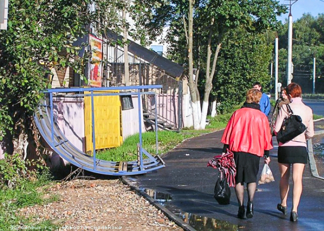 Остановка без проблем могла рухнуть на голову человека, дожидающегося здесь автобуса, или покалечить любого случайного прохожего. За примером далеко ходить не надо. Меньше года назад, в начале ноября 2011 года, остановка рухнула на двух женщин и маленькую девочку, «ЧП» произошло на проспекте Гагарина. По словам очевидцев этой неприятной сцены, нижняя металлическая планка остановки в считанных сантиметрах пролетела над головой ребенка, зацепила за руку ее мать и повалила обоих в грязь. Затем потащила за собой другую девушку и улетела в овраг. Тогда об этом происшествии даже упомянули на еженедельной планерке в администрации города Смоленска. Но выводов о том, почему тяжелая металлическая конструкция улетела, как карточный домик, никто делать не взялся, сославшись на то, что ветер был действительно сильный и могло унести не только остановку. На минувшей планерке в горадминистрации, которая состоялась на следующий день, 10 сентября, о упавшей на Краснинском шоссе остановке никто и словом не обмолвился. Видимо, так уж повелось в России, говорить начинают лишь после того, как кого-то ударит по голове, повалит в грязь или утащит в овраг... Но это уже другая история. Говорит и показывает Смоленск Нужно отметить, что остановку после падения никто не удосужился поднять в вертикальное положение, ни то что закрепить. «Остановка на Краснинском шоссе так и валяется никому не нужная», - пишет одна из посетительниц популярного смоленского интернет-форума. Примечательно, что здесь же нам удалось найти очень интересные мнения смолян по поводу всего происходящего. «Вообще с этими новыми остановками просто беда, - пишет этот же посетитель форума, - Когда ремонтировали Нормандию-Неман и Николаева, прикрепить эти павильоны, очевидно, позабыли. Вот и летают они от каждого сильного ветра, угрожая жизни находящихся возле них людей!». Некоторые и вовсе не довольны их внешним видом - «Старые, хоть и примитивные и от погоды не защищённые, были изящными и симпатичными, - пишет посетитель под псевдонимом Dimedrol, - Позор города». Другие же предлагают взять дело остановок в свои руки - «Предлагаю выкладывать фотки остановок, оставшихся без остановочных павильонов, а то может быть наши городские «ответственные» лица не знают, что в городе существует такая проблема!». Кроме этого, по постам некоторых форумчан становится ясно, что остановки страдают не только от непогоды и нерасторопности рабочих, но и от самих жителей города: «Их не только ветром валит. Ушлый народ снимает с них поликарбонат (на теплицы видимо). Мой знакомый (очень ответственный и порядочный человек) увидел как-то вечером двух таких воров. Разогнав их, сбегал домой за шуруповертом и накрутил шурупов побольше, чтобы в следующий раз не повадно было откручивать. А так проезжая по городу очень много вижу «раздетых» остановок» (текст поста пришлось поправить из-за обилия ненормативной лексики). Есть вопросы - нет ответа Мы обратились в комитет по транспорту администрации города Смоленска. «Наш комитет проблемами остановок не занимается, - ответили нам в приемной, - Эти вопросы курирует Управление жилищно-коммунального хозяйства администрации города Смоленска. К ним и обращайтесь». На все наши вопросы (Почему остановки не прочно закреплены и периодически падают от ветра? Будут ли их укреплять? Почему, по