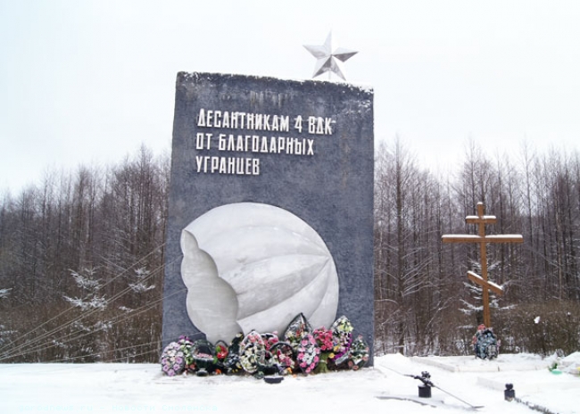 Не хватит слов, чтоб в полной мере Их ратный подвиг оценить, Они как свечи догорели, А души будут вечно жить... Эти строчки из стихотворения воина-интернационалиста и поэта Геннадия Пызина высечены на монументе. Ушедшим в бой Сейчас в Угранском районе мало что напоминает о событиях 70-летней давности. Разве что памятник 4-му воздушно-десантному корпусу. Он представляет собой парашют из алюминия, прикованный к бетонному основанию. Хотя в 1960-е годы это место было культовым для советских десантников. Каждый год сюда приезжали действующие воины-парашютисты, чтобы поклониться праху защитников угранской земли. Для любого подразделения ВДВ считалось почетным десантироваться в этих местах. Еще по приказу легендарного «десантника №1», командующего ВДВ Василия Маргелова, советские воины несли шефство над районом, каждый год здесь устраивались показательные выступления бойцов. На самом месте высадки первых десантников когда-то стоял неприметный памятник в виде бетонного короба, который разрушили время и людское забвение. И если бы не историческая память тех, кто выбрал своей профессией защиту Родины, то этот героический уголок Смоленщины мог бы оказаться совершенно забытым. «Инициатором восстановления этого памятника стал Союз ветеранов, мы вместе обратились к губернатору Сергею Антуфьеву, который выделил деньги на памятник из своего резервного фонда, - рассказал глава Желаньинского сельского поселения, исследователь военной истории Виктор Виноградов. - Это просто необходимо было сделать, ведь здесь высадились десантники 4-го корпуса, здесь проходил последний рубеж обороны от врага. Мы должны поклониться их подвигу». Ржев, Вязьма, Желанья 70 лет тому назад - в январе 1942 года началась Ржевско-Вяземская операция, которая знаменовала собой продолжение контрнаступления советских войск под Москвой. Целью операции было окружить и разгромить часть сил фашистской группы армий «Центр» и не допустить их к Москве. В результате наступления Калининского и Западного фронтов советскому командованию удалось достичь определенных успехов и прорвать оборону гитлеровцев на нескольких участках. Однако ситуация на всей протяженности маршрута оставалась напряженной. Фашисты зверствовали на оккупированной территории, они сжигали сотни деревень на своем пути; как свидетельствуют историки, в том же Угранском районе погиб каждый второй житель. В такой обстановке могли помочь только слаженные и беззаветно храбрые действия элиты советских войск - десантников. Чтобы подготовить дальнейшее наступление основных частей Красной армии, необходимо было провести подготовительную работу в тылу противника, перерезать автомобильную дорогу Вязьма-Юхнов и железную дорогу Вязьма-Брянск. Не дать противнику спокойной жизни - такова была основная задача, которую возложило командование на десантников 4-го воздушно-десантного корпуса. В тот момент они должны были совершить невозможное: отвлечь на себя внимание огромной гитлеровской машины, сражаясь практически голыми руками. Высадка десанта на оккупированной территории - это необычайно сложная и всегда отягощенная огромными человеческими потерями боевая задача. Десанту приходилось высаживаться в полной темноте, зачастую идя на верную гибель; но в тот момент ставка не видела других шансов остановить захва
