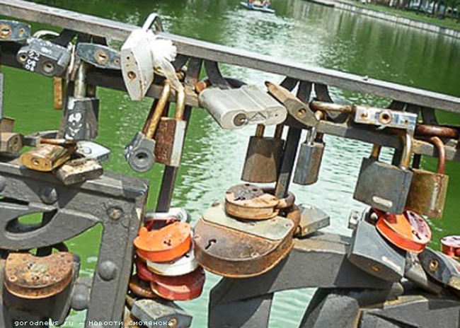 На выходных гуляла с детьми в Лопатинском саду и очень удивилась количеству «свадебных» замков, которые молодожены по традиции вешают на мост. Они уже висят здесь гроздьями, будут с ними что-то делать?