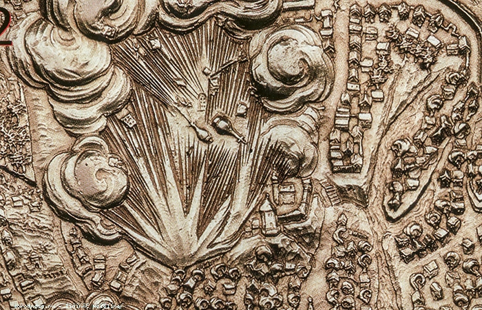 Взрыв пороховых погребов рядом с собором. Сигизмундова медаль, 1611 год.